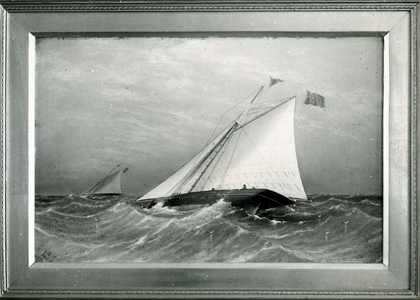 Fartygstavla hos fru Ruth Pålsson. Två kappseglande yachter. Oljemålning på duk signerad C.K.M. 1880. Skåne, Malmöhus län, Viken.