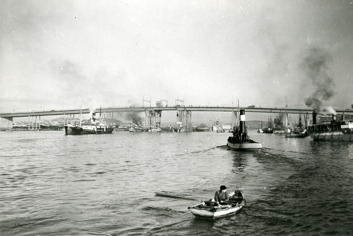 Foto visande hamnen i Göteborg med Götaälvsbron sedd från Lilla Bommen.