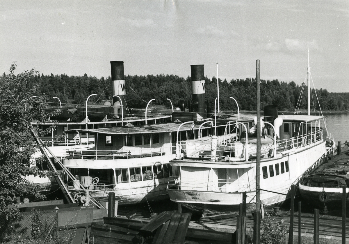 Foto i svartvitt visande Furusunds slip, Högmarsö, omkring 1963, med från vänster Waxholm III, Östanå I och Sunnan (Ex Albrektsund), ägda av Waxholms Nya Ångfartygs AB