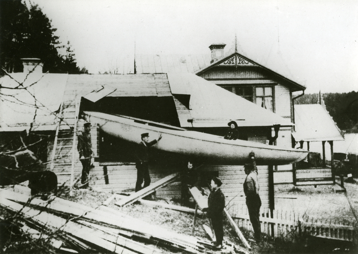 Den första, i Gamleby byggda kapplöpningsbåten, av Knut Holm på vinden i ett uthus invid bostaden och uttagen genom väggen , då upphovsmannen tydligt glömt bort att båten skulle ut vattnet. Hamnkapten Knut Holm
