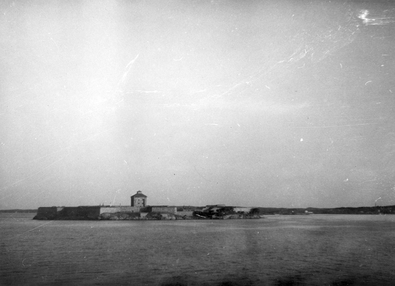 Göteborgs örlogsdepå. Vedettbåten har lämnat Göteborgs örlogsdepå och passerar sedan gamla Älfsborgs fästning. Fil. lic. Gunnar Jonssons undersökningsresa till västkusten juni 1940. 66.