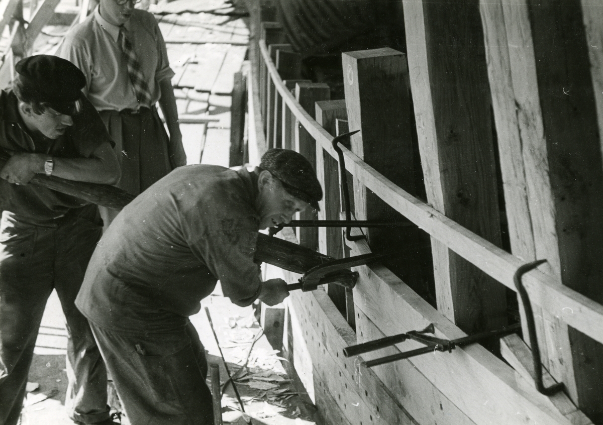 "Sätta till en bordvägsgång" på backen till isländskt fiskefartyg under byggnad. Bordet pressas in med hjälp av en "bändhake" och fästes med tvingar.