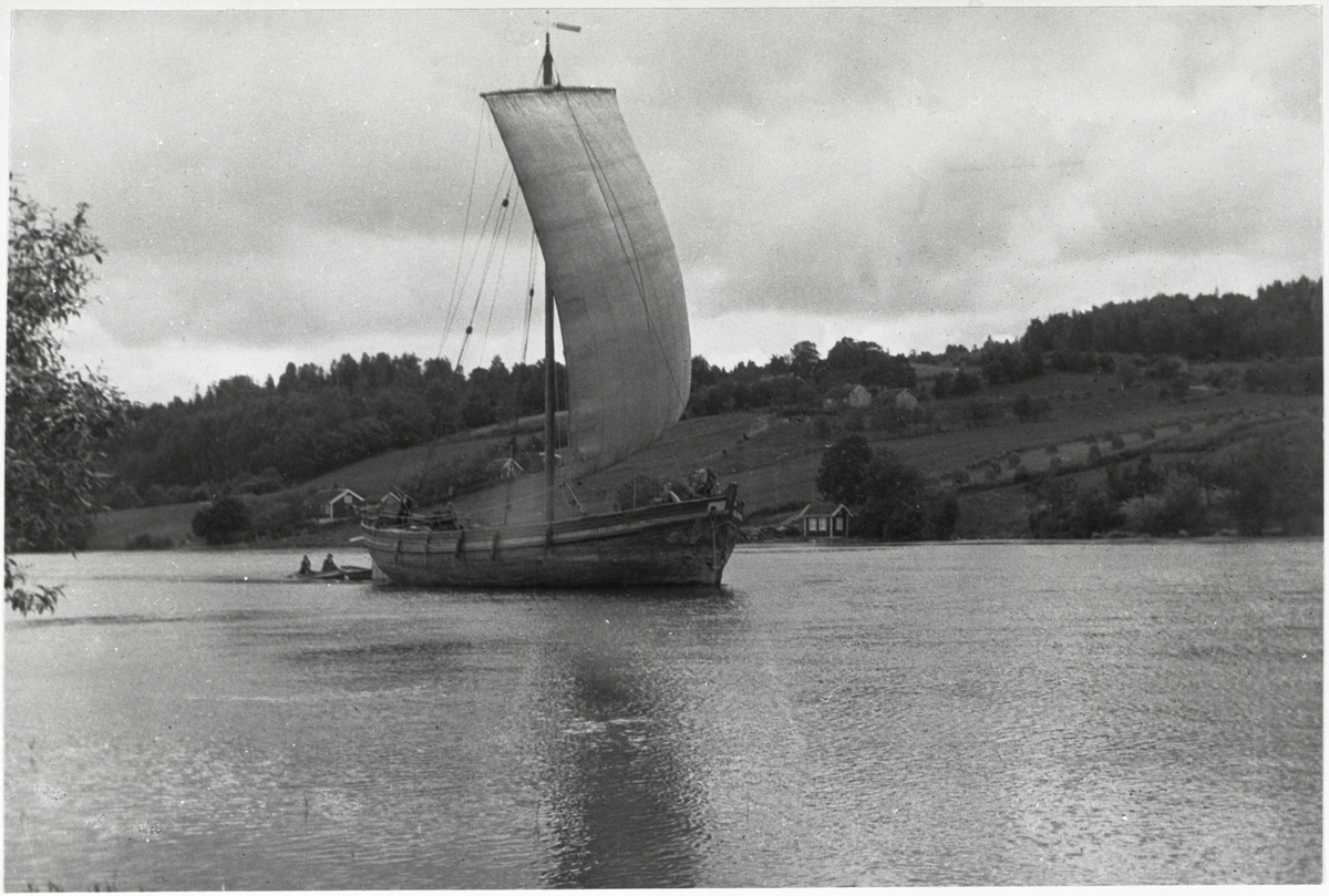"Fotograferad på Göta älv, troligen 1935. Den sista utan motor. Dom flesta hörde hemma i Vänersborg och de brukade komma till Göteborg med tegellaster. Efter kriget riggades många ner och försågs med motor."