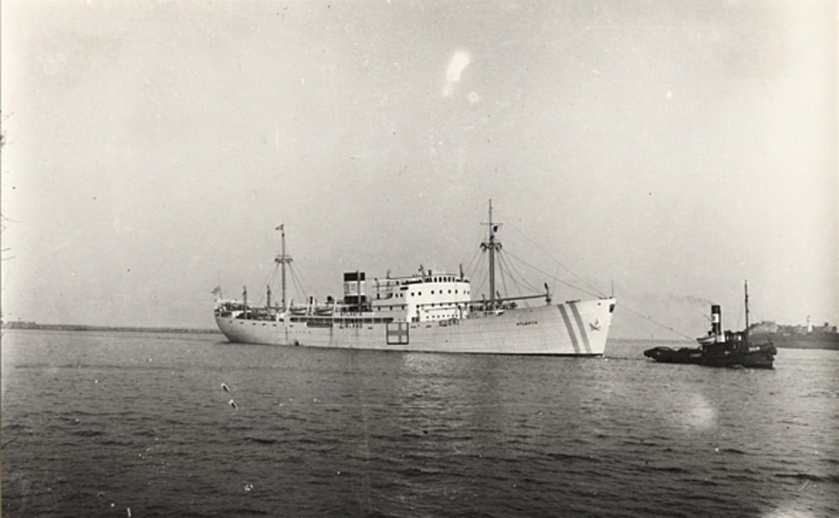 Foto i svartvitt visande lastmotorfartyget "ATLANTA" av Helsingfors under bogsering i Köpenhamn 1939 - 1940-talet.