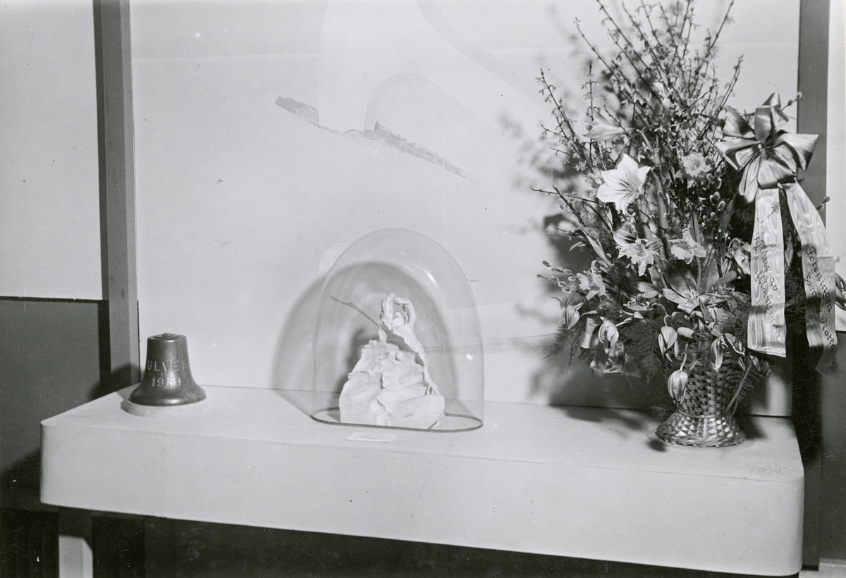 Minnesutställning i örlogsavdelningen över ubåten ULVEN som sänktes av en tysk mina den 16 april 1943. Uppställning med modell i gips till minne av "Ulvenmännen" samt Ulvens skeppsklocka med årtalet 1931.