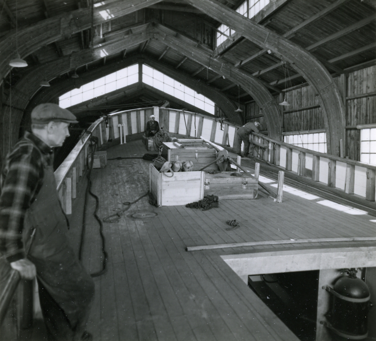 Däcket just före stapelavlöpningen, där trossarna till stoppankarna ligger upplagda, klara att löpa ut, när ankarna släppts för att stoppa upp fartyget.