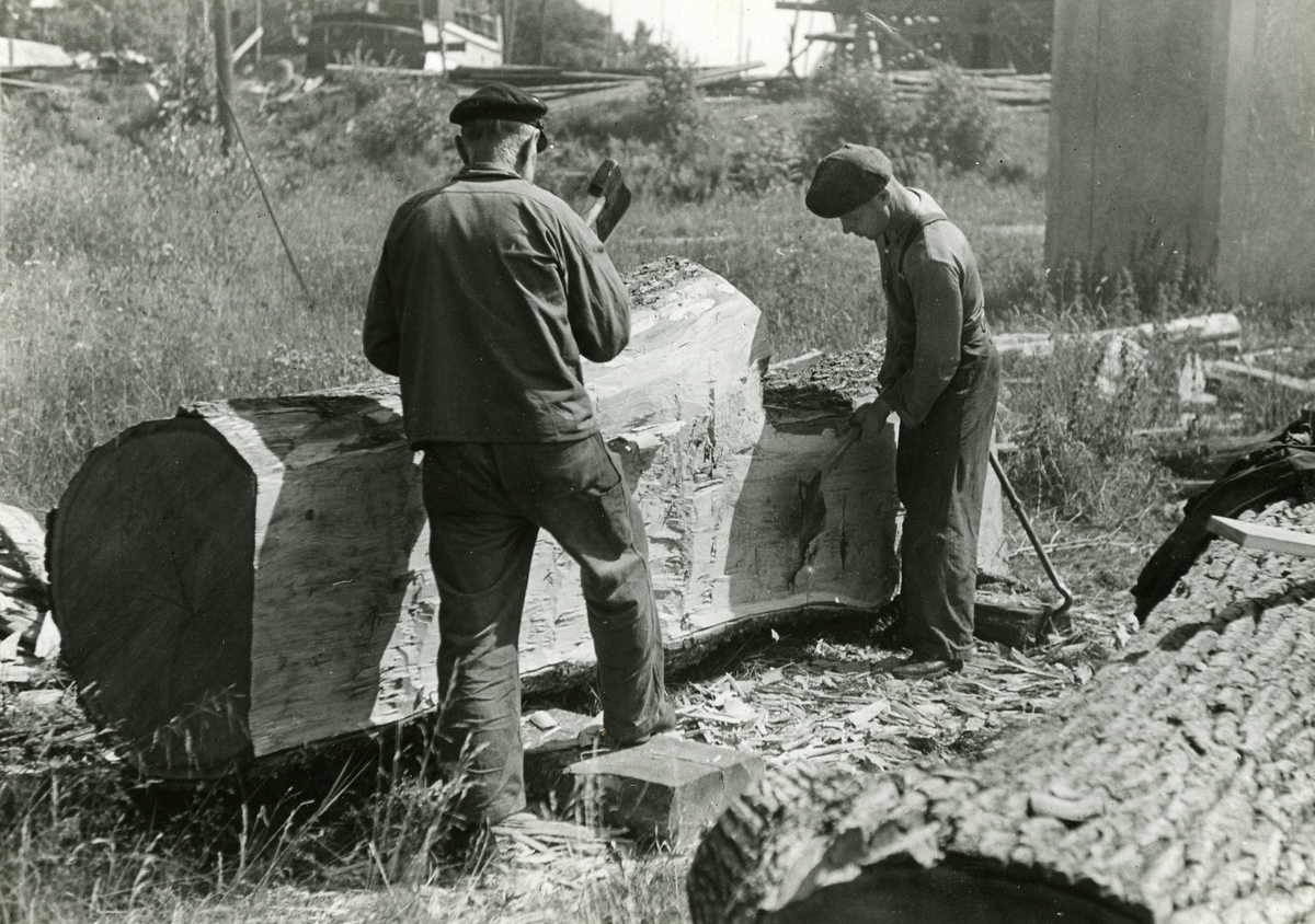 Skrädning av ekstock till akterstäv- "hjärtstock"- till isländsk fiskebåt under byggnad. Yxorna äro s.k. hjärtumsyxor, större typen. (se foto av sådan under Frihultstillverkningen).