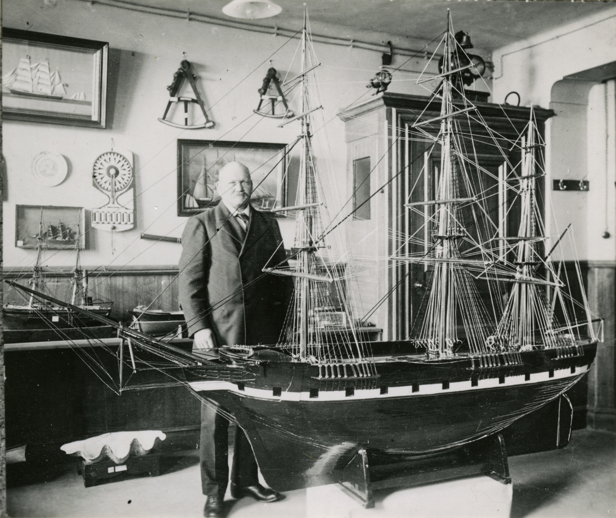 Kapten Pettersson vid sitt avslutande arbete med reparation av riggen till ett fregattriggat skepp i det gamla Sjöfartsmuseet på Skeppsbron 46, Stockholm.