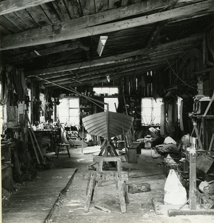 Interiör av verkstadens sydlänga mot väster. En Lynaes-jolle under byggnad. Christian Madsens båtbyggeri. Foto N(ils) Nilsson aug (19)64. Danmark, Själland, Lynaes.