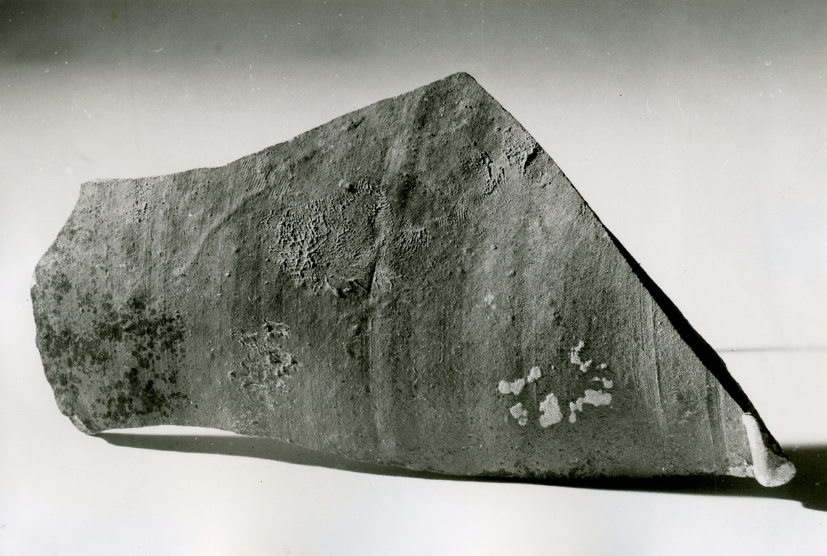 Lergodsfragment, gråaktig ytterglasyr från vraket Marianne vid Simpnäs i Stockholms län.