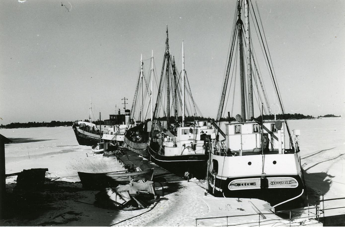 Seus II, Vänervik, Thellef, Agneta och Eken liggande i hamnen den 14 mars 1963.