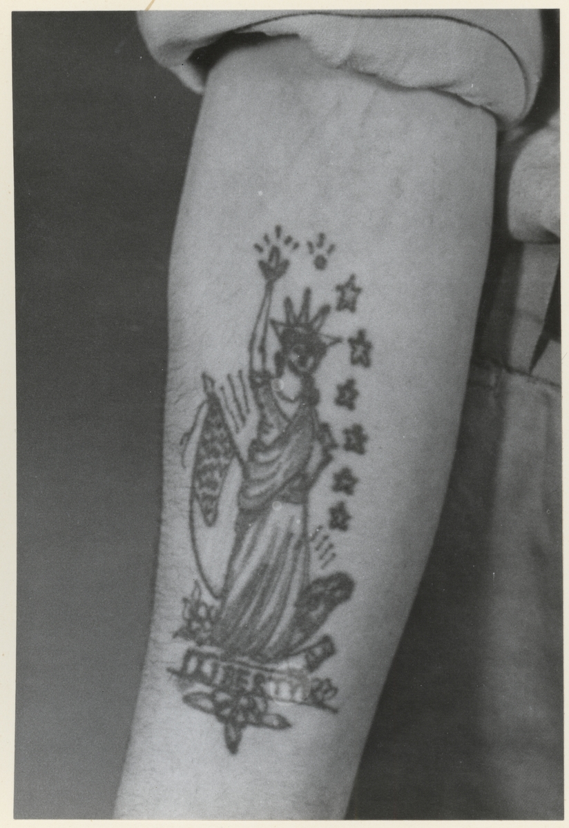 Tatuering på vänster underarm, utförd i USA 1926 för 1. Föreställer amerikanska frihetsgudinnan.