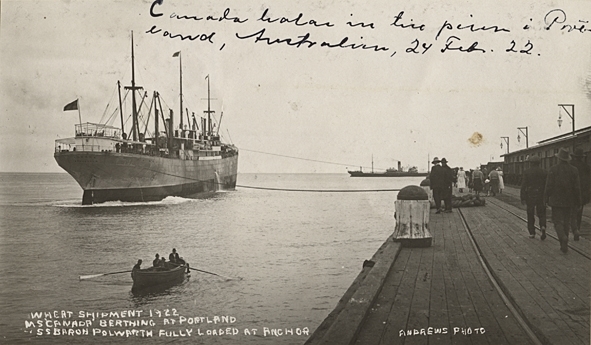 "Wheat shipment 1922. M.S. Canada berthing at Portland. S.S. Baron Polwarth fully loaded at anchor. Andrews Photo."