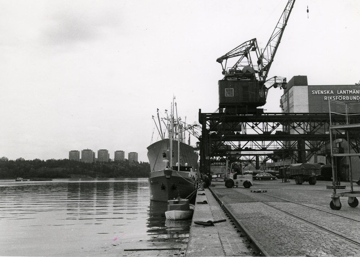 Foto i svartvitt visande hamnbild från Värtan i Stockholm, vid kaj lastmotorfartygen "Wartena" av Grundsund och "Nimbus" av Göteborg.