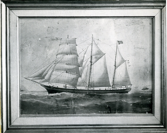 Fartygstavla hos fru Ruth Pålsson. Sigyn av Salsåker. Kapt. N.O. Sörensson. Akvarell utan signatur. Skåne, Malmöhus län, Viken.