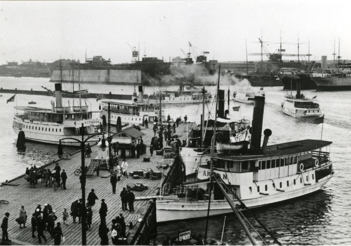 Foto visande träpiren i Göteborg omkring 1940 med passagerarångfartyget "Ärlan" t.h. i förgrunden, t.v. passagerarångfartyget "Styrsö II".