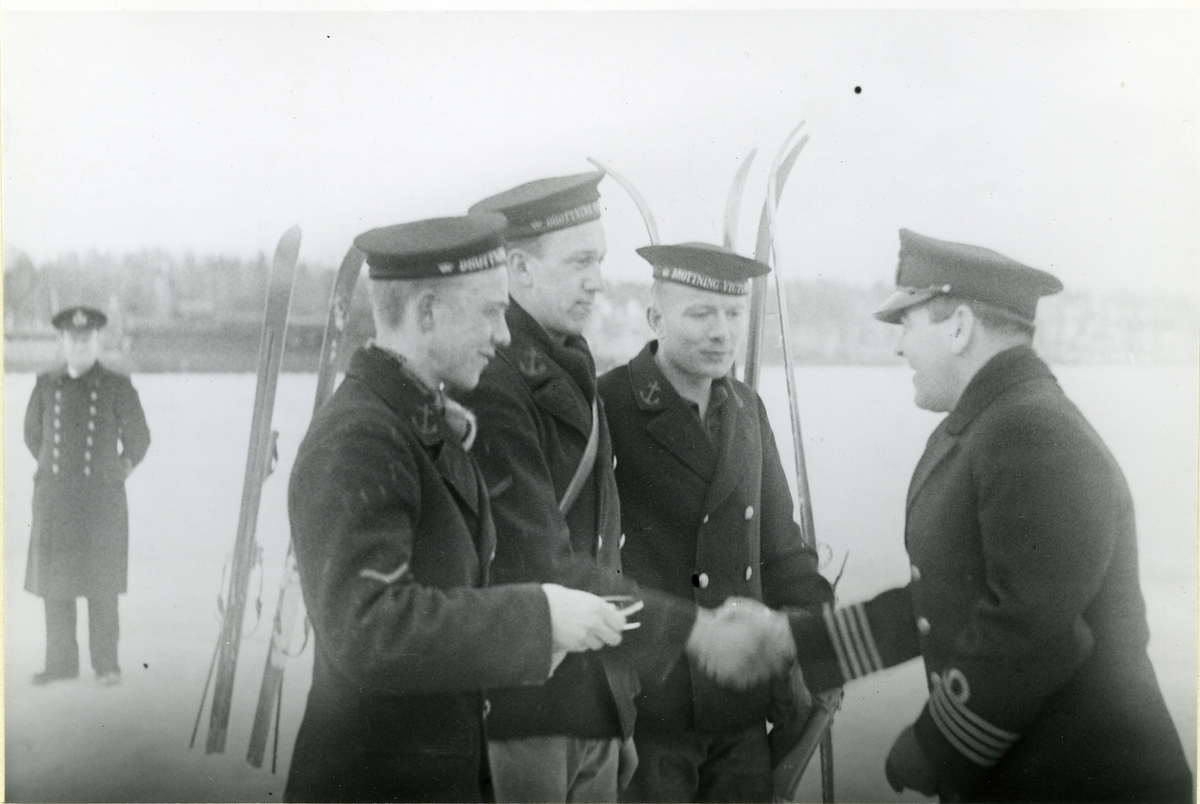 H.M.S.D.V:s segrande lag tackas av Kom.kapten Landqvist och gratuleras till sin seger.