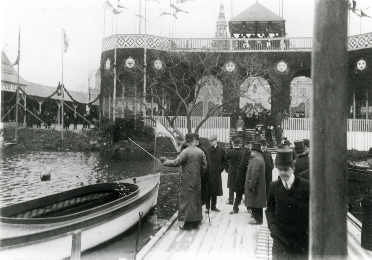 Pontonkajen till sportutställningen år 1905 vid Djurgårdsbrunnsviken. Dåvarande kronprins Gustavs son Gustav Adolf (sedemera Gustav VI Adolf) närmast till höger. Vid kajen Waterloo.