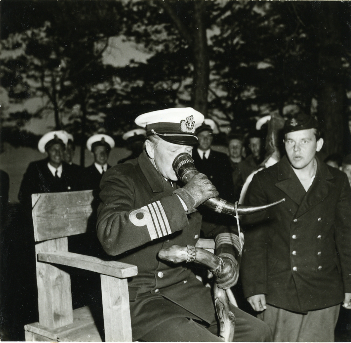 "Vikingar, sen hur havet sjunker" ropar vikingarna när deras hövding, kommendör Moje Östberg, ritualenligt tömmer mjödhornet vid Eldledningsskolans 25-årsjubileum, den 16 juni 1949.