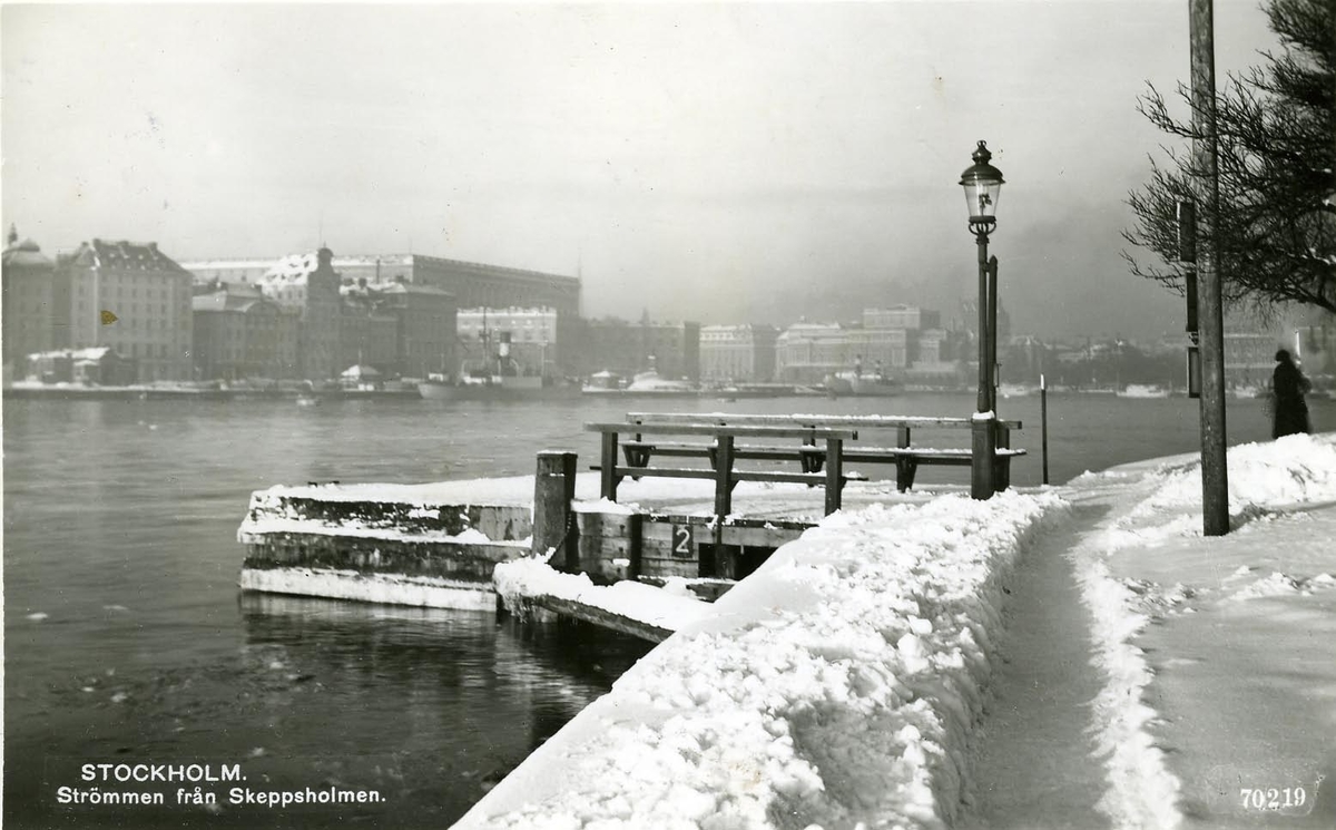 Vykort i svartvitt visande Stockholm från omkring 1940-talet.