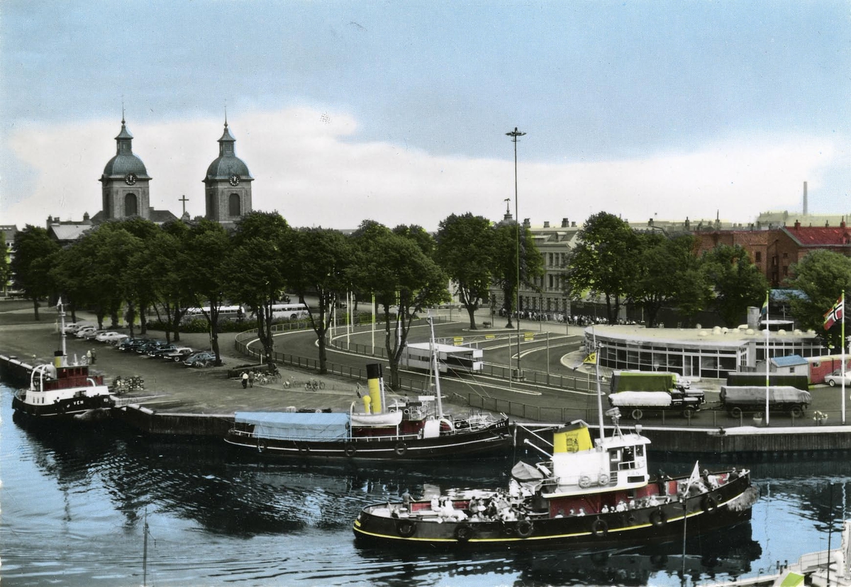 I mitten på vykortet bogserbåten "Bore" av Landskrona, såld till Danmark. T.v. bogserbåten "Ven". Bogserbåten t.h. okänd. Foto från omkring 1950.