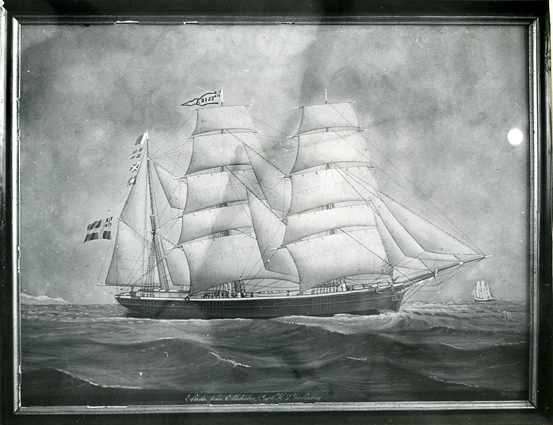 Fartygstavla hos fru Ruth Pålsson. Ellida från Elleholm. Capt. H.P. Kullenberg. Akvarell signerad L.P. Sjöström 1883. Skåne, Malmöhus län, Viken.