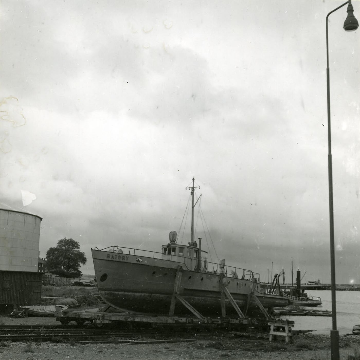 Polska flyktingbåten Batory, internerad i Visby, för tillfället uppdragen på slip för underhållsarbetens utförande.