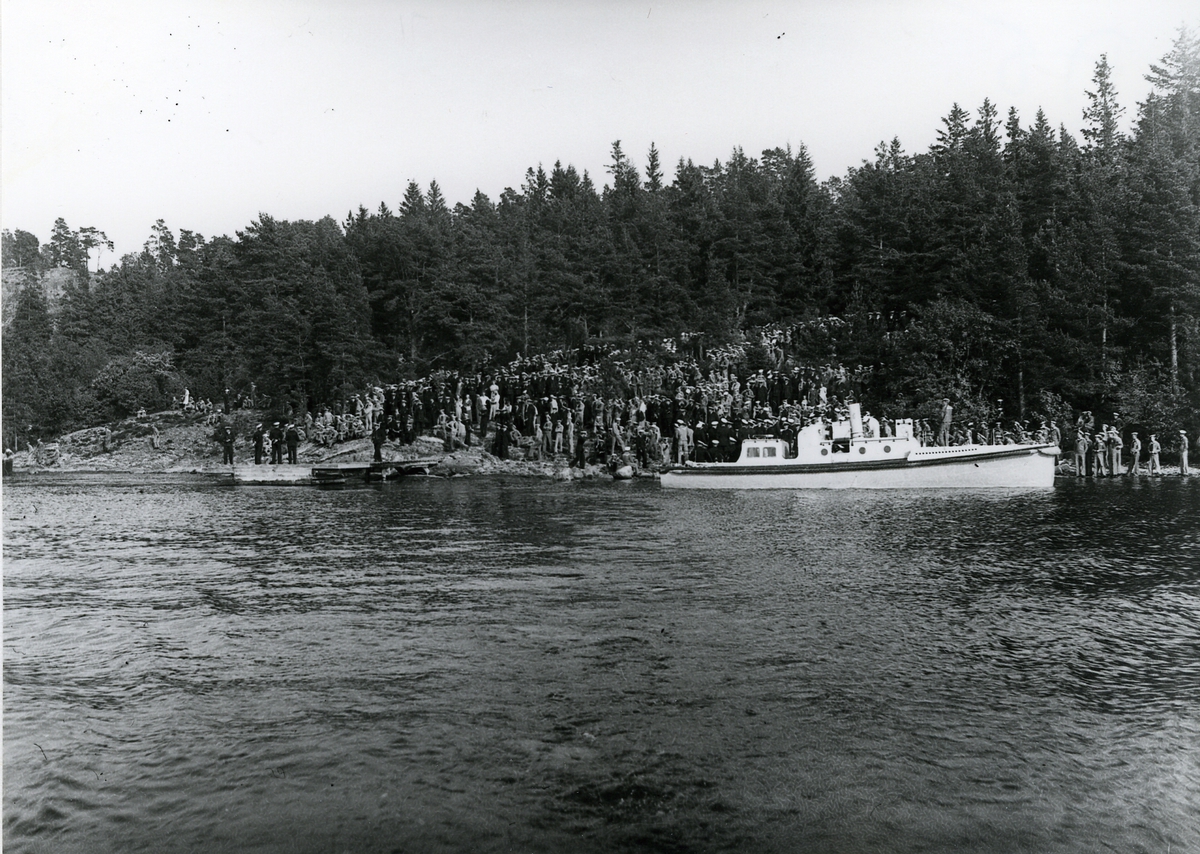 Landsatt manskap på strand. Motorbarkass i förgrunden.