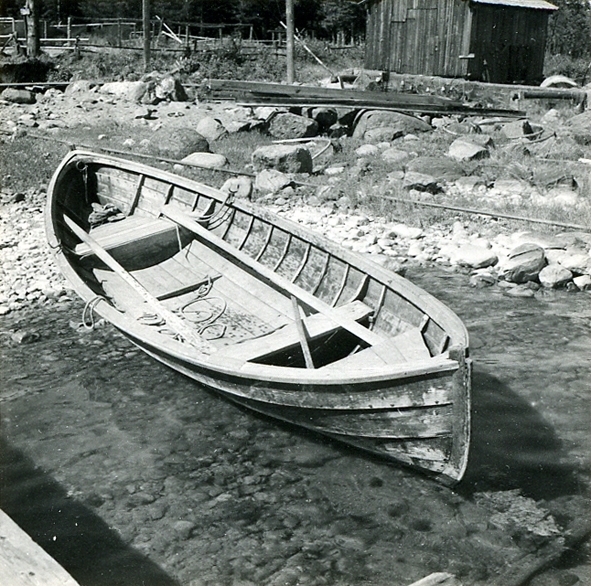 Skötbåt av äldre typ med täljda naturvuxna kinningar och vinningar samt uppstigande stävar.