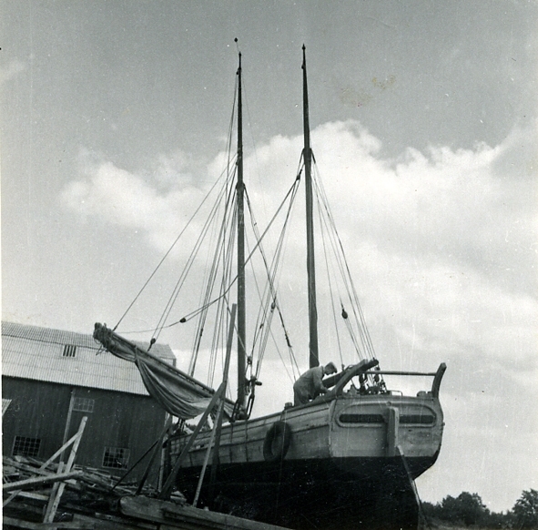 Galeasen Förlig Vind på slip vid Ekenäs varv.Sedd akterifrån om babord.
