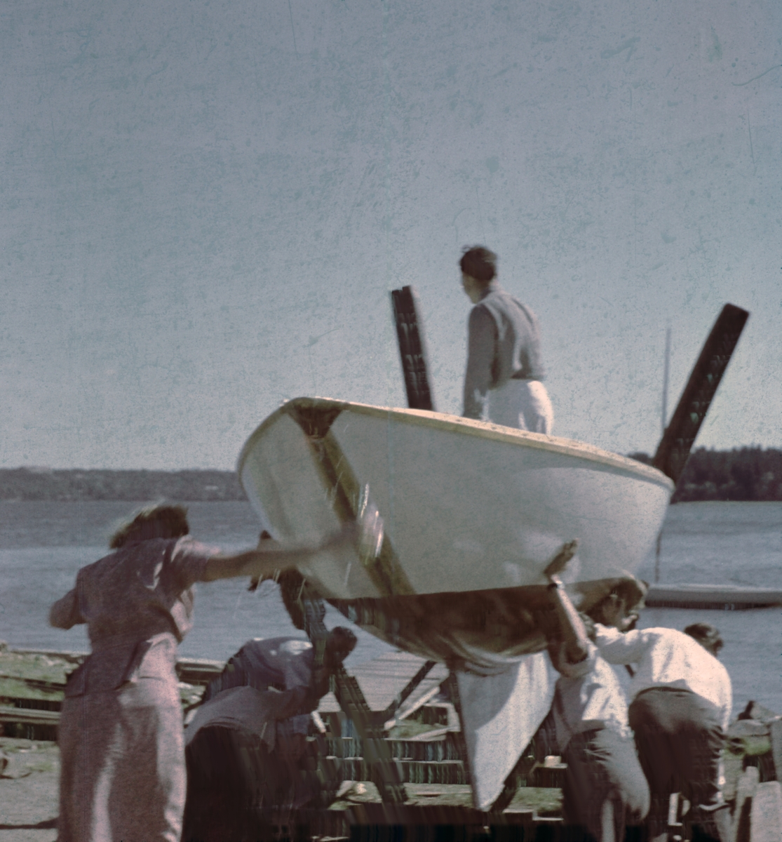 Första sjösättningen av segelbåten DECIBEL vid Skärsätra båtklubb, Lidingö. I båten ägaren Holger Marcus, längst t v troligen hustrun Aina.