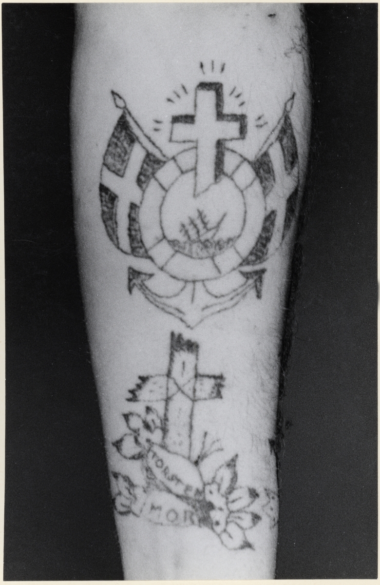 Tatueringar på vänster underarm, utförda av Augustsson själv.