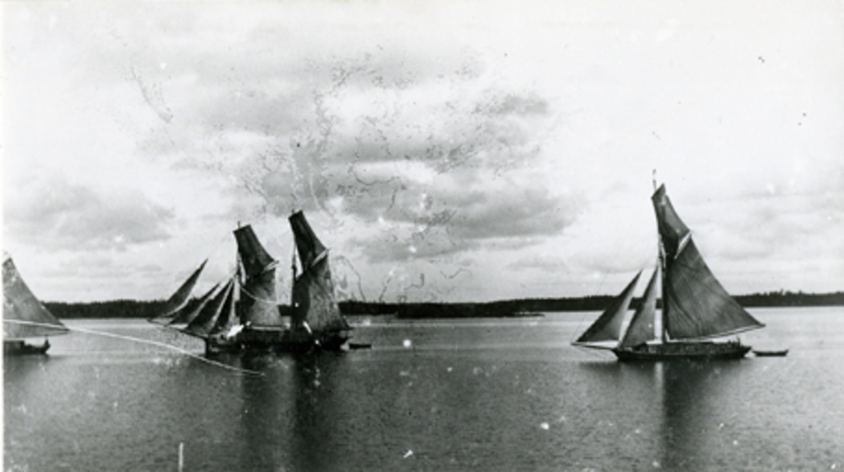 Två mastad skonare och en jakt på Furusundsfjärden (Stockholms skärgård). 1890-tal