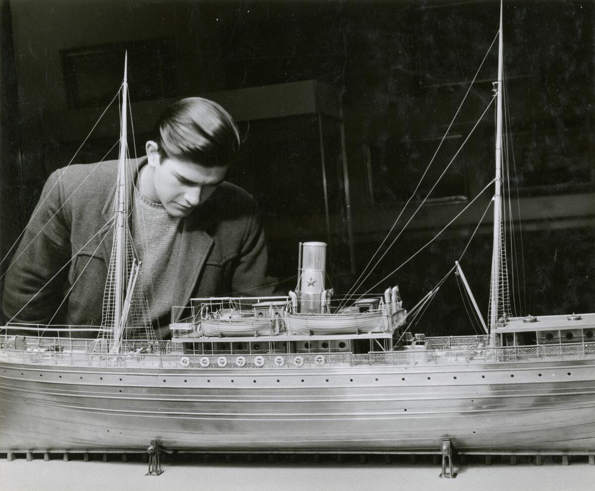 Utställning i Sjöfartsavdelningen, avdelning för Äldre ångfartyg. En ung man tittar på fartygsmodellen av AEOLUS.