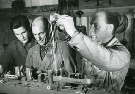 Modellbyggarna (fr. v.) Oscar Blixth, Oscar Wahlström och Sture Sandmark reparerar en modell av jagaren HMS Wale i Sjöhistoriska museets modellverkstad.