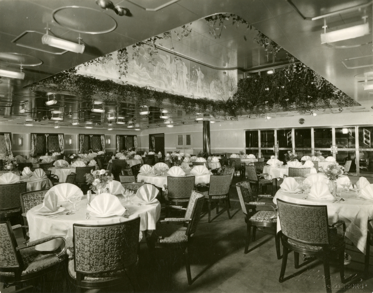 Första klassens matsal med möbler från NK på M/S KUNGSHOLM.