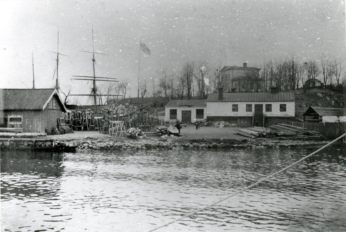 Foto visande Beckholmen i Stockholm före unionsupplösningen 1905 [anm. nya flaggan kom 1907. Ännu 1906 var det lag på att hissa unionsflaggan i Sverige trots unionsupplösningen året innan.]