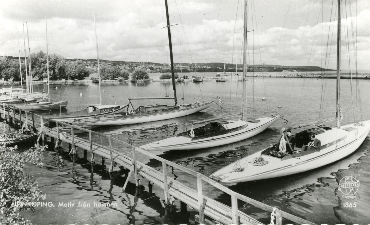 Jönköping. Motiv från hamnen, 1958. Längst t.h. 55-kvadratmeters skärgårdskryssaren Hexan (14,4 x 2,20).