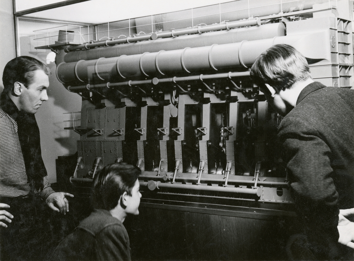 Utställning i Sjöfartsavdelningen, avdelningen för Nyare varv. Tre undomar tittar på en maskinmodell.