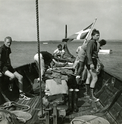 Besättningen förbereder avseglingen från Tranerodde vid Fyens sydvästkust. Th vid horisonten synes Helsnäs. Imme Gram under segling i Lilla Bält.