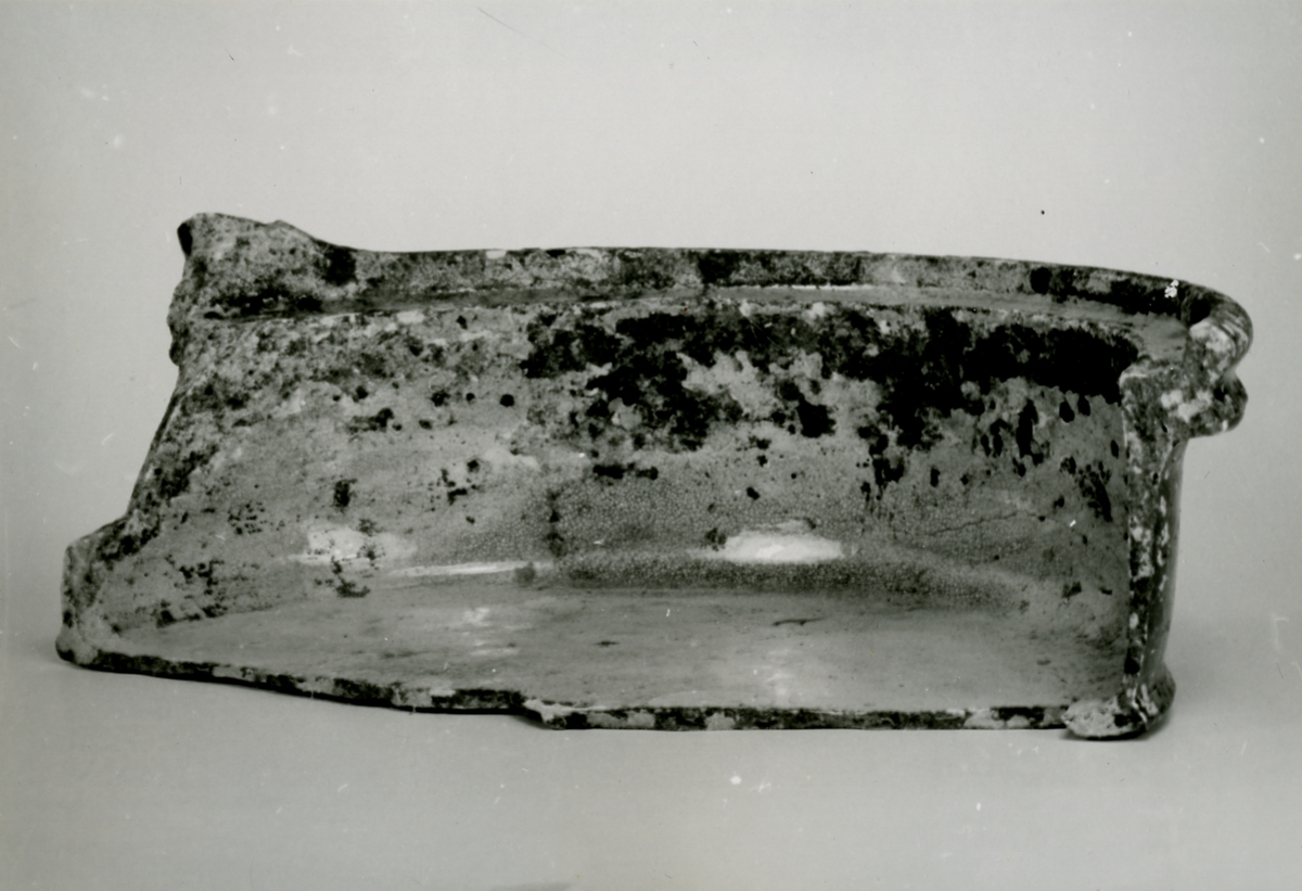 Fragment av lerkärl, flat botten raka kanter. Sjöfynd från Djurhamn."