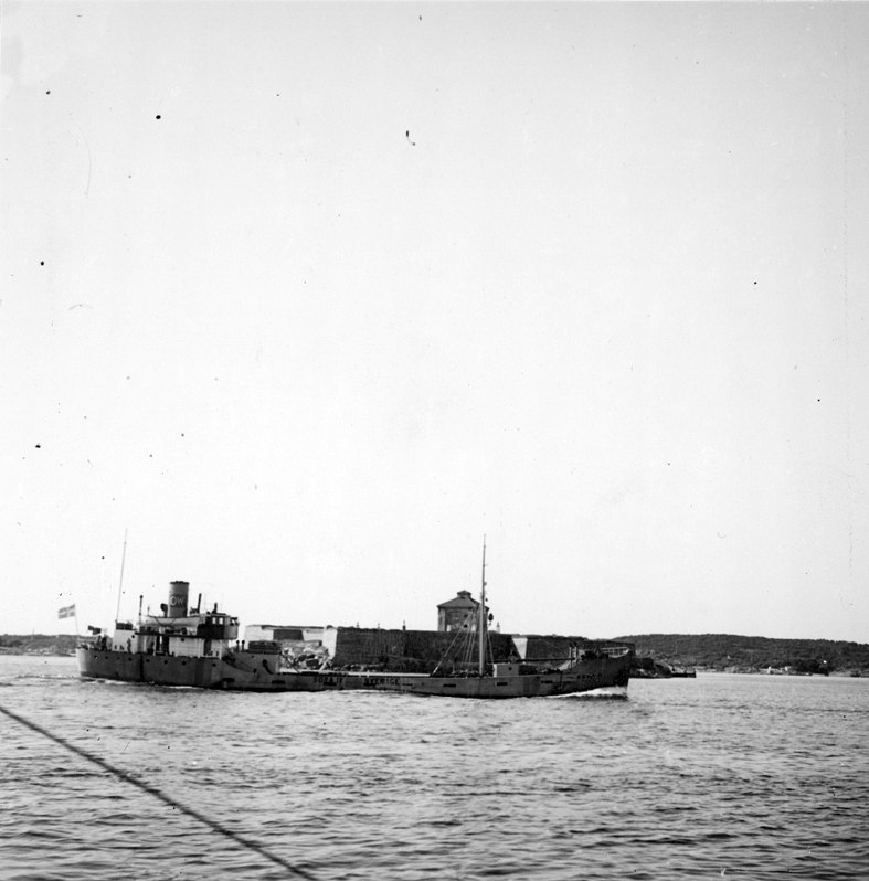 Göteborgs örlogsdepå. HM Hjvb 384:s resa. Det under återresan eskorterade tankmotorfartyget Soya IV av Stockholm passerar Gamla Älvsborg på väg uppför Göta älv. Fil Gunnar Jonssons undersökningsresa till västkusten juni 1940. 190