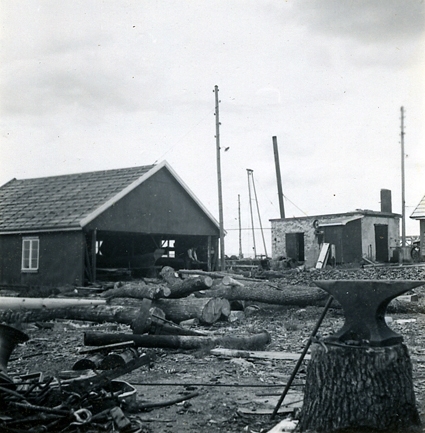 Fredrik Jonssons varv. Båtbyggnadsskjul och eldhus för baspannan och slipvinschen.