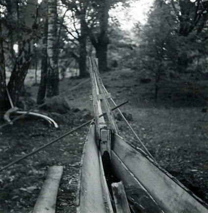 Titel: Rågösvensken Granbacks båtbygge. Nr329, förstäven Nr330, akterstäven Nr331, Granback demonstrerar akterstävens konstruktion för kand. Rolf Vallerö och lektor C. E. Nordenskiöld. Småland, Kalmar län, Tunaläns härad, Misterhults socken, Virbo.