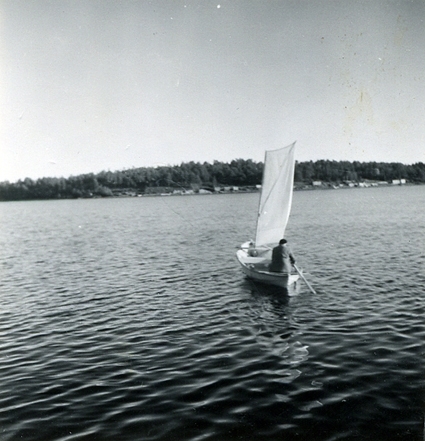 Handlande och båtbyggare Konrad Dalins "snugga", som han själv byggt. K.D. seglar sin "snugga". Ångermanland, Nätra tingslag och socken, Ulvö hamn.