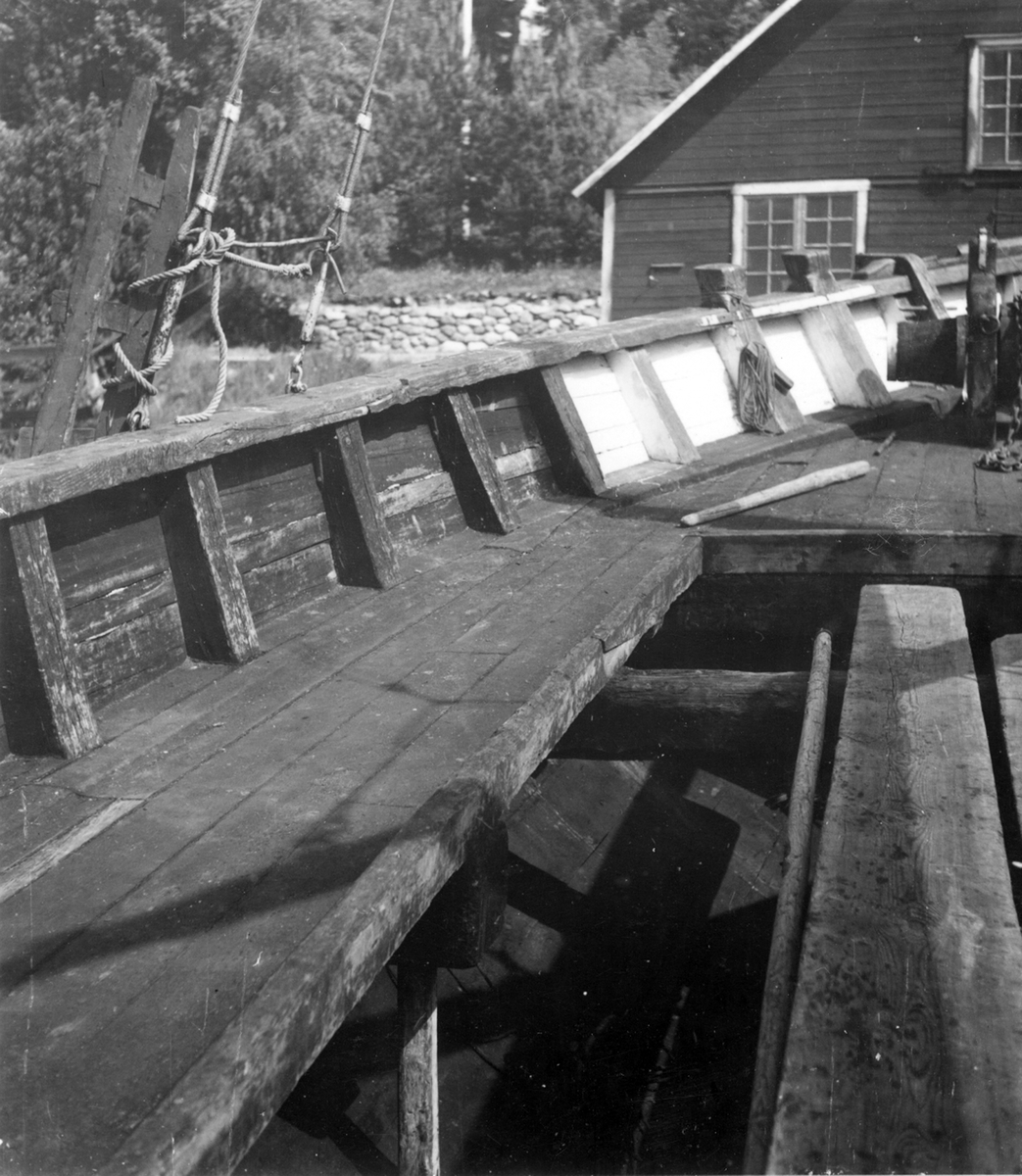 Uppland, Stockholms län, Frötuna skeppslag, Länna socken, Vettershaga. Vedjakten Adalia, däcksbild babordssidan akterifrån. Foto i juni 1950.