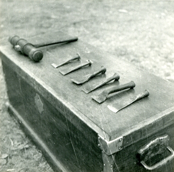 Timmerman Karl Albin Karlssons drivjärn och drivklubbor liggande på hans timmermanskista. 6 olika slagsdrivjärn samt drivklubba. [När skutorna... en klubbor till.]