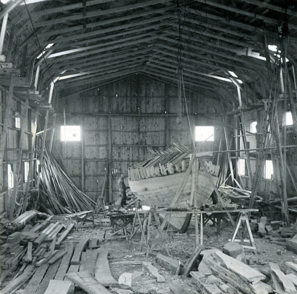 Lunds skeppsvarv.Lotsbåt för Gotland under byggnad. Bildena visar bl.a systemet för spantens uppstagning under byggnadsarbetet.