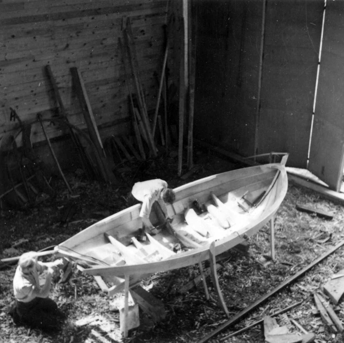 Hugo Olssons varv. Båtbyggare Inge Olsson lägger in intimren i en blekingseka.