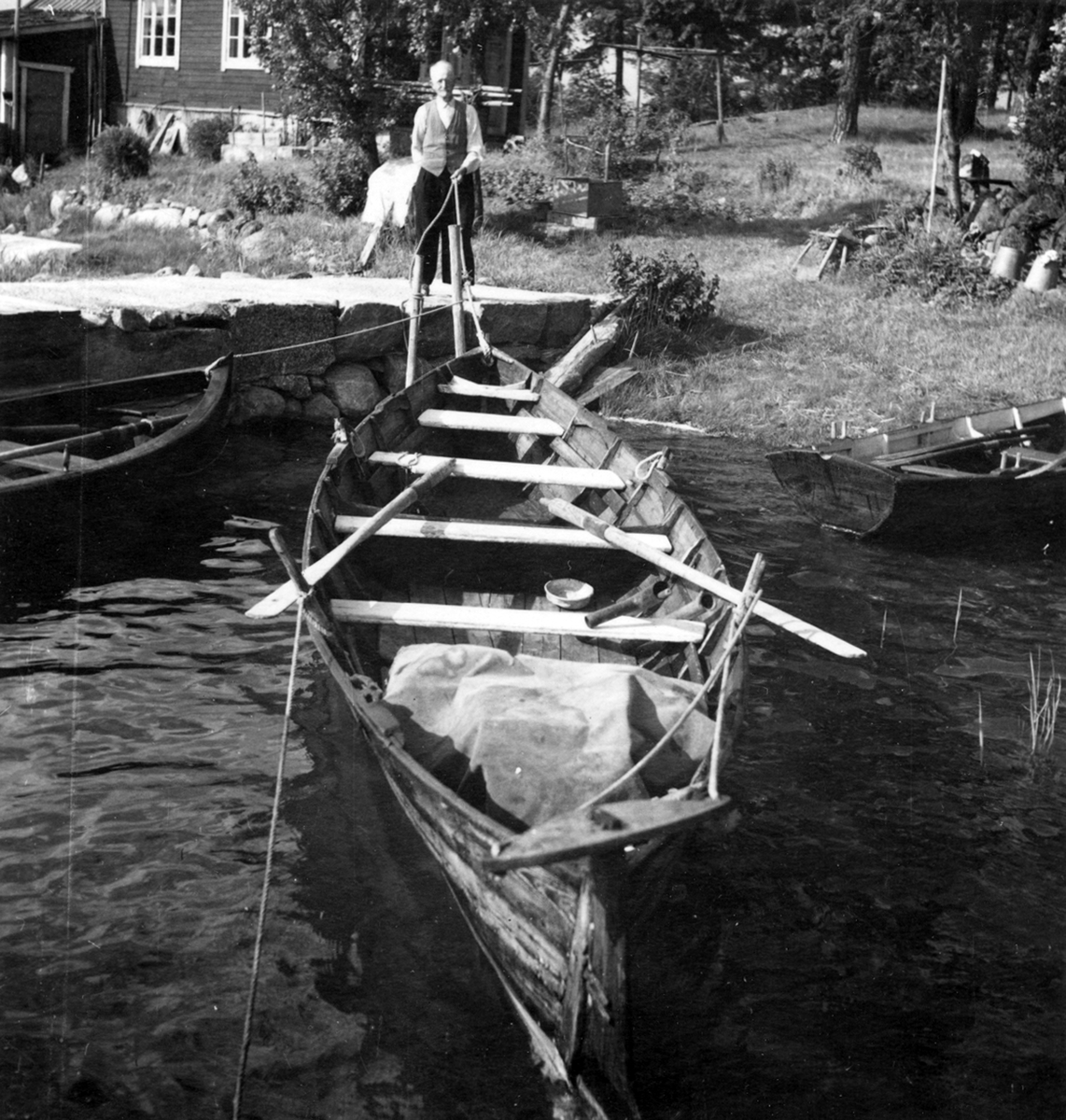 Uppland, stockholms län, Frötuna skeppslag, Länna socken, Gåsskär. segelsömmare Örlund vid sin båt.